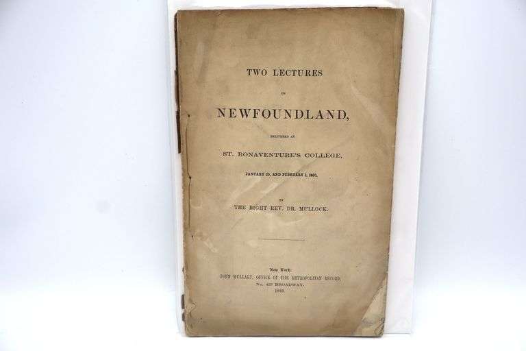 The 1860 publication titled Lectures on Newfoundland was authored by Right Reverend Dr. John Thomas Mullock, the Roman Catholic Bishop of St. John's. This work comprises a series of lectures delivered at St. Bonaventure's College in St. John's, Newfoundland, on January 25 and February 1, 1860. The lectures were subsequently published in New York by John Mullaly in the same year.